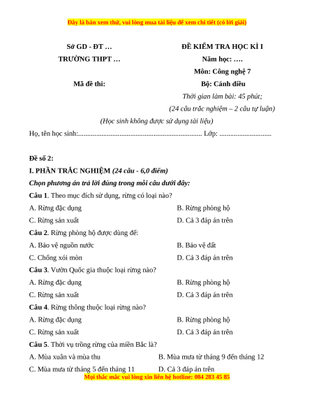 ĐỀ KIỂM TRA HỌC KÌ I TRƯỜNG THPT … Năm học: …. Môn: Công nghệ 7 Mã đề thi: Bộ: Cánh diều