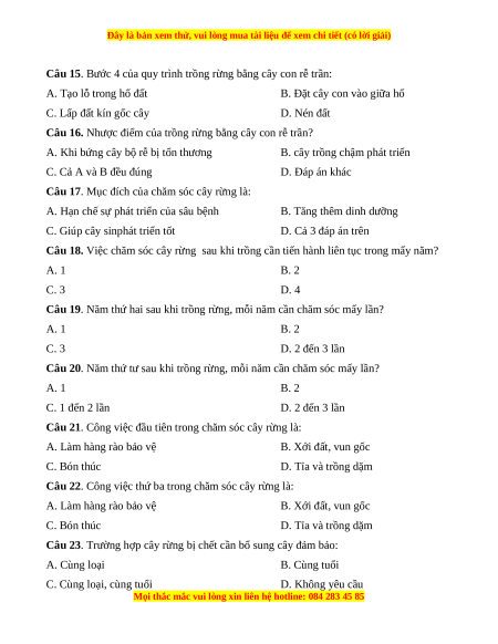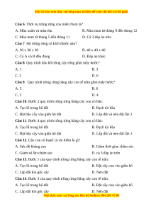 Câu 20. Năm thứ tư sau khi trồng rừng, mỗi năm cần chăm sóc mấy lần? A. 1 B. 2 C. 1 đến 2 lần D. 2 đến 3 lần