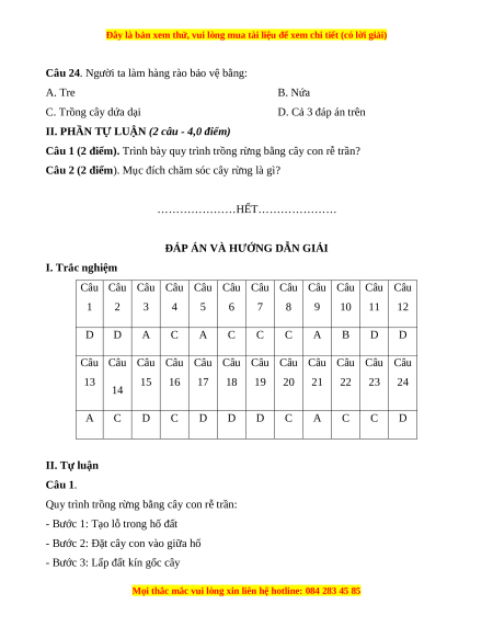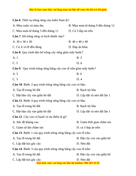 Câu 7. Hố trồng rừng có kích thước nào? A. 30 x 30 x 30 B. 40 x 40 x 40 C. Cả A và B đều đúng D. Đáp án khác