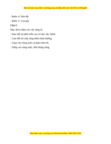 Câu 2 (2 điểm). Mục đích chăm sóc cây rừng là gì?