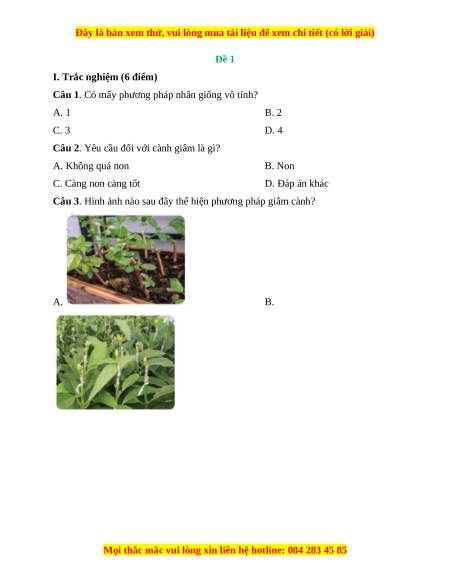 Câu 1. Có mấy phương pháp nhân giống vô tính? A. 1 B. 2 C. 3 D. 4