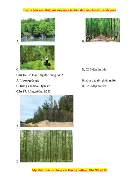 Câu 16. Có loại rừng đặc dụng nào? A. Vườn quốc gia