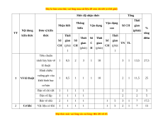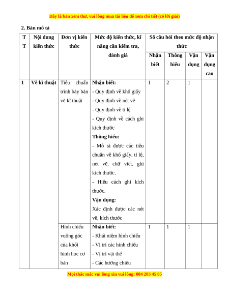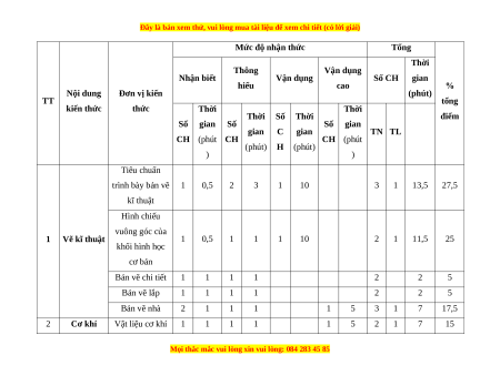 Mức độ nhận thức Tổng Thời Thông Vận dụng Nhận biết Vận dụng Số CH gian hiểu cao % Nội dung Đơn vị kiến (phút) TT tổng kiến thức thức Thời Thời Thời Số Thời điểm Số gian Số Số gian gian C gian TN TL CH (phút CH CH (phút (phút) H (phút) ) ) Tiêu chuẩn trình bày bản vẽ 1 0,5 2 3 1 10 3 1 13,5 27,5 kĩ thuật Hình chiếu vuông góc của 1 Vẽ kĩ thuật 1 0,5 1 1 1 10 2 1 11,5 25 khối hình học cơ bản Bản vẽ chi tiết 1 1 1 1 2 2 5 Bản vẽ lắp 1 1 1 1 2 2 5 Bản vẽ nhà 2 1 1 1 1 5 3 1 7 17,5 2 Cơ khí Vật liệu cơ khí 1 1 1 1 1 5 2 1 7 15