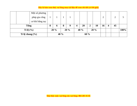 Một số phương pháp gia công 1 1 1 1 2 2 5 cơ khí bằng tay Tổng 8 6 8 9 4 20 2 10 16 4 45 Tỉ lệ (%) 20 % 20 % 40 % 20 % 100% Tỉ lệ chung (%) 40 % 60 %