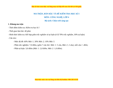 - Tailieugiaovien.com.vn giới thiệu bộ đề cuối kì 1 gồm đầy đủ ma trận và lời giải chi tiết môn Công nghệ lớp 4 Chân trời sáng tạo mới nhất nhằm giúp Giáo viên có thêm tài liệu tham khảo ra đề thi Công nghệ lớp 4.