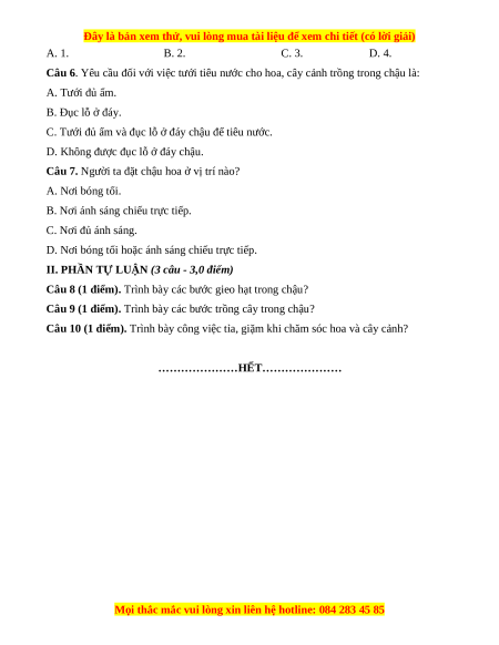 Câu 6. Yêu cầu đối với việc tưới tiêu nước cho hoa, cây cảnh trồng trong chậu là: A. Tưới đủ ẩm. B. Đục lỗ ở đáy.