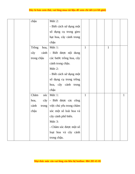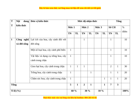 Chăm sóc hoa, cây cảnh trong chậu 1 1 1 1 20 Tổng 5 1 2 1 1 7 3 Tỉ lệ (%) 60 % 30 % 10 % 100%