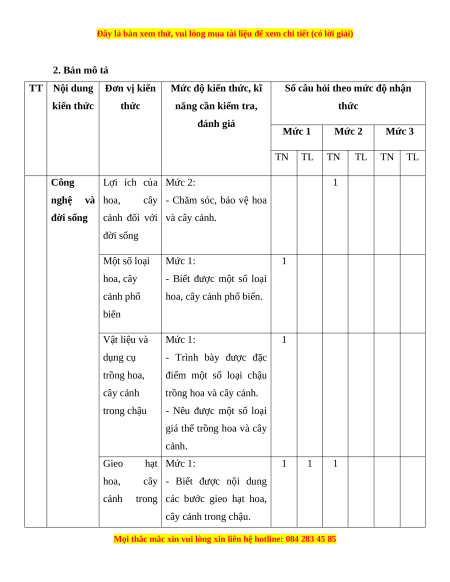 - Phần tự luận: 3,0 điểm (Mức 1: 2,0 điểm; Mức 2: 1,0 điểm).