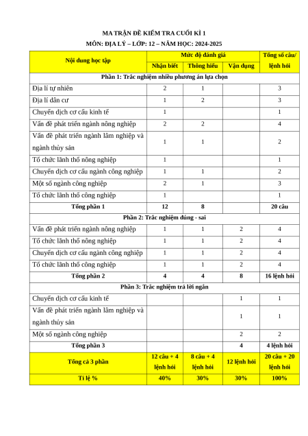 MÔN: ĐỊA LÝ – LỚP: 12 – NĂM HỌC: 2024-2025 Mức độ đánh giá Tổng số câu/ Nội dung học tập Nhận biết Thông hiểu Vận dụng lệnh hỏi