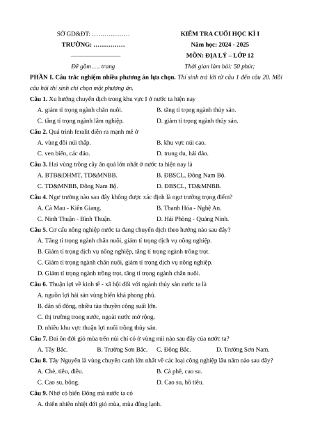 MÔN: ĐỊA LÝ – LỚP 12 Đề gồm …. trang