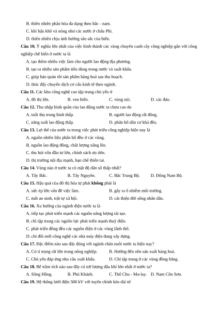 Câu 13. Lợi thế của nước ta trong việc phát triển công nghiệp hiện nay là