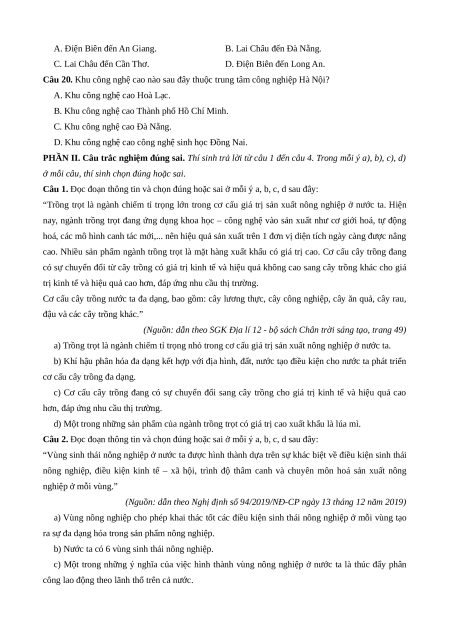 Câu 20. Khu công nghệ cao nào sau đây thuộc trung tâm công nghiệp Hà Nội?