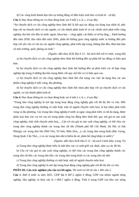 Phần 1: Trắc nghiệm nhiều phương án lựa chọn Địa lí tự nhiên 2 1 3 Địa lí dân cư 1 2 3