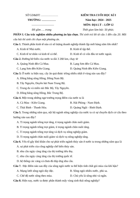 Đề thi Cuối kì 1 Địa lý 12 Kết nối tri thức (Đề 5)