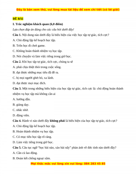 Câu 1. Nội dung nào dưới đây là biểu hiện của việc học tập tự giác, tích cực?