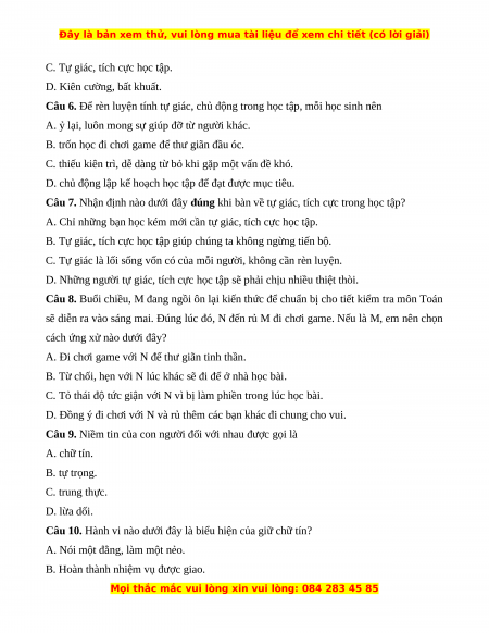 Câu 9. Niềm tin của con người đối với nhau được gọi là A. chữ tín. B. tự trọng. C. trung thực. D. lừa dối.
