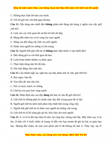 Câu 11. Nội dung nào dưới đây không phản ánh đúng nội dung ý nghĩa của việc giữ chữ tín?