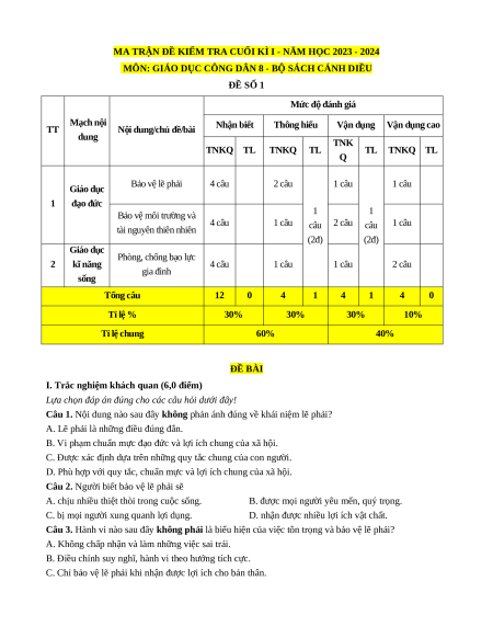 Nội dung/chủ đề/bài Nhận biết Thông hiểu Vận dụng Vận dụng cao dung TNK TNKQ TL TNKQ TL TL TNKQ TL Q Giáo dục Bảo vệ lẽ phải 4 câu 2 câu 1 câu 1 câu 1 đạo đức 1 1 Bảo vệ môi trường và 4 câu 1 câu câu 2 câu câu 1 câu tài nguyên thiên nhiên (2đ) (2đ)