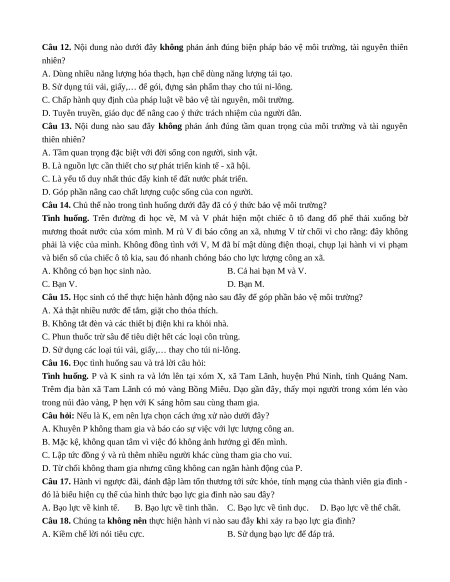 Câu 12. Nội dung nào dưới đây không phản ánh đúng biện pháp bảo vệ môi trường, tài nguyên thiên nhiên?