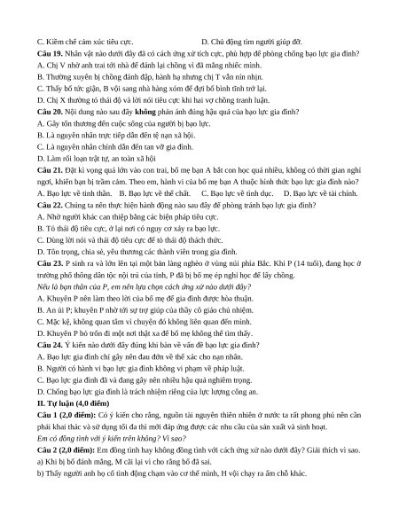 Câu 19. Nhân vật nào dưới đây đã có cách ứng xử tích cực, phù hợp để phòng chống bạo lực gia đình?