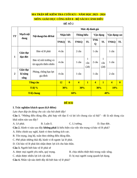 Giáo dục Phòng, chống bạo lực 2 kĩ năng 4 câu 1 câu 1 câu 2 câu gia đình sống Tổng câu 12 0 4 1 4 1 4 0 Tỉ lệ % 30% 30% 30% 10% Tỉ lệ chung 60% 40% ĐỀ BÀI