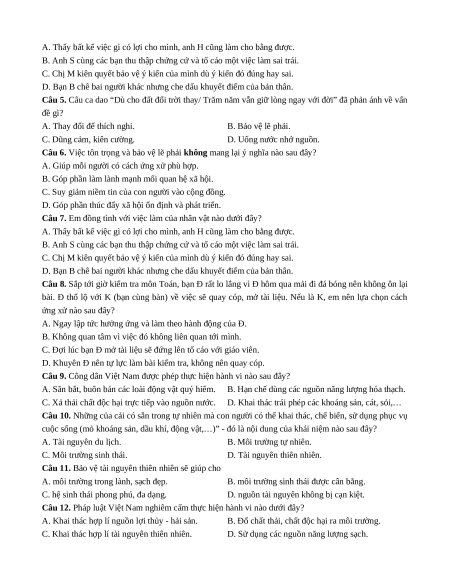 Câu 14. Em đồng tình với quan điểm nào sau đây khi bàn về vấn đề bảo vệ môi trường và tài nguyên thiên nhiên?