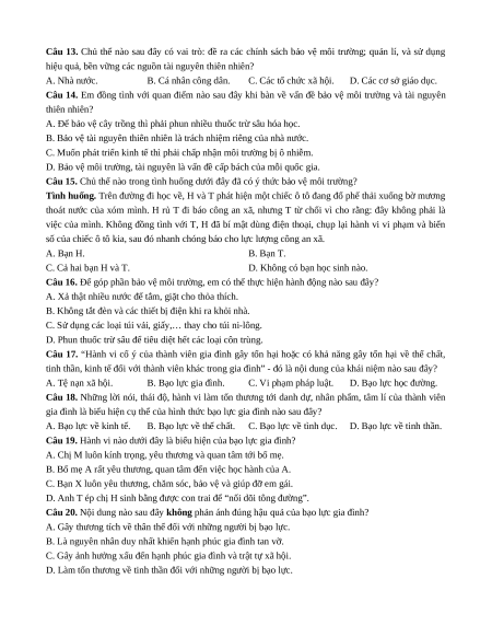 A. Tệ nạn xã hội. B. Bạo lực gia đình. C. Vi phạm pháp luật. D. Bạo lực học đường.