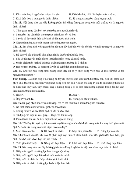 Câu 14. Em đồng tình với quan điểm nào sau đây khi bàn về vấn đề bảo vệ môi trường và tài nguyên thiên nhiên?