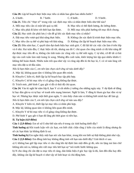 Câu 20. Lập kế hoạch thực hiện mục tiêu cá nhân bao gồm bao nhiêu bước? A. 6 bước. B. 7 bước. C. 8 bước. D. 9 bước.
