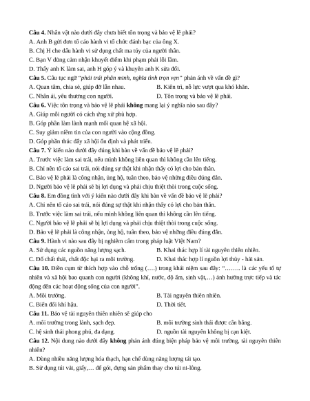 Câu 12. Nội dung nào dưới đây không phản ánh đúng biện pháp bảo vệ môi trường, tài nguyên thiên nhiên?