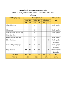 MÔN: GIÁO DỤC CÔNG DÂN – LỚP 9 – NĂM HỌC: 2024 – 2025 ĐỀ 3 - CD Nội dung học tập Mức độ đánh giá Tổng số câu Nhận biết Thông hiểu Vận dụng hỏi TN TL TN TL TN TL Sống có lí tưởng 2 1 1 4 trắc nghiệm Khoan dung 2 1 3 trắc nghiệm