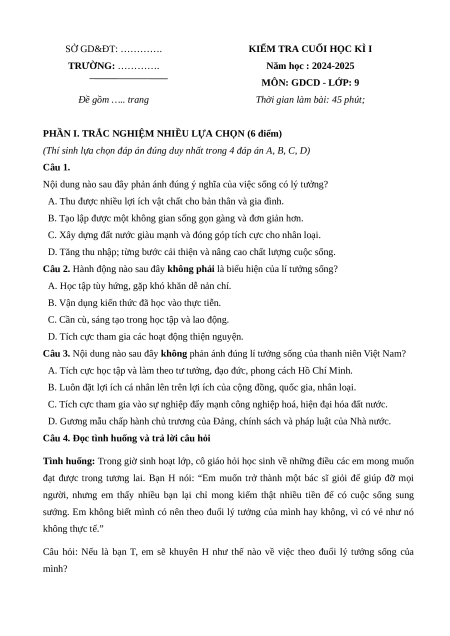 TRƯỜNG: …………. Năm học : 2024-2025 MÔN: GDCD - LỚP: 9 Đề gồm ….. trang