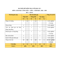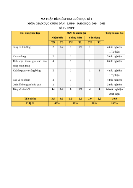 MÔN: GIÁO DỤC CÔNG DÂN – LỚP 9 – NĂM HỌC: 2024 – 2025 ĐỀ 2 - KNTT Nội dung học tập Mức độ đánh giá Tổng số câu hỏi Nhận biết Thông hiểu Vận dụng TN TL TN TL TN TL Sống có lí tưởng 2 1/2 1 1/2 1 4 trắc nghiệm 1 Tự luận Khoan dung 2 1 3 trắc nghiệm