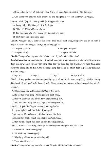 Câu 6. Một trong những truyền thống tốt đẹp của dân tộc Việt Nam là A. ích kỉ. B. khoan dung. C. hẹp hòi. D. yếu đuối.