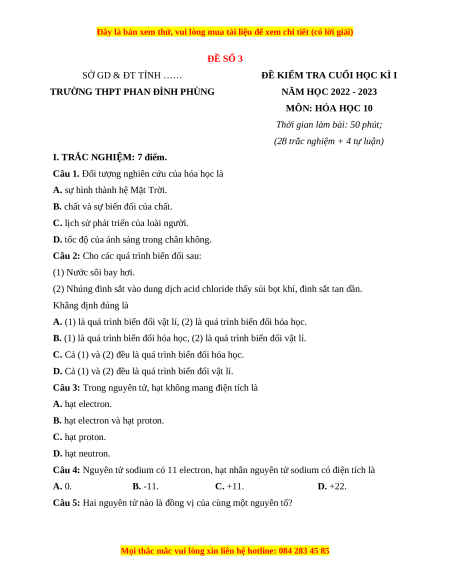 TRƯỜNG THPT PHAN ĐÌNH PHÙNG NĂM HỌC 2022 - 2023 MÔN: HÓA HỌC 10