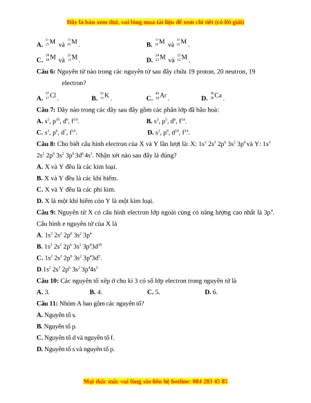 Câu 7: Dãy nào trong các dãy sau đây gồm các phân lớp đã bão hoà: A. s2, p10, d6, f14. B. s2, p5, d6, f14. C. s2, p6, d7, f14. D. s2, p6, d10, f14.