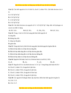 Câu 12: Cho biết nguyên tố A ở ô thứ 16, chu kì 3, nhóm VIA. Cấu hình electron của A