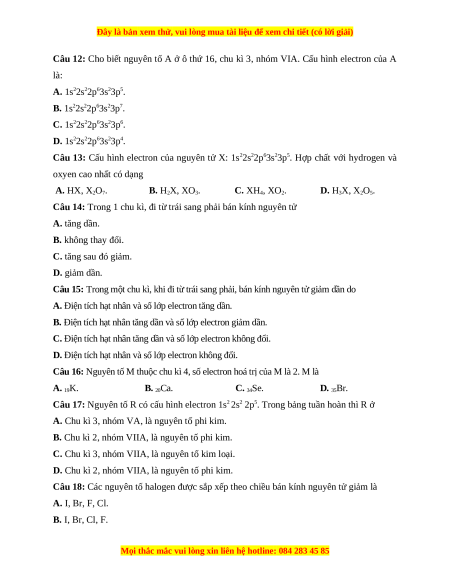 Câu 14: Trong 1 chu kì, đi từ trái sang phải bán kính nguyên tử A. tăng dần. B. không thay đổi.