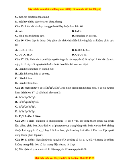Câu 29: (1 điểm) Nguyên tố phosphorous (P) có Z =15, có trong thành phần của phân