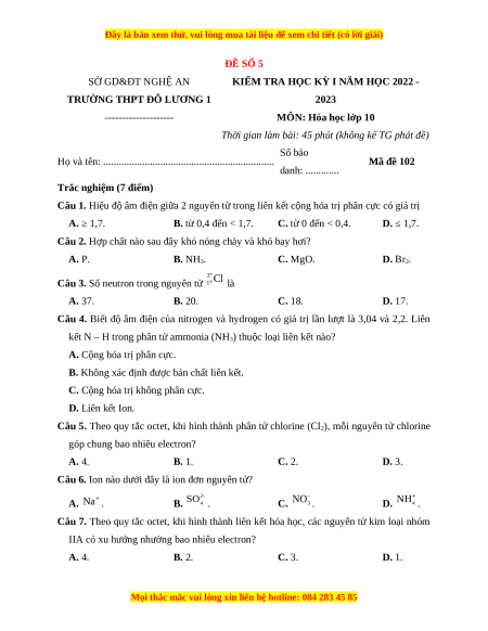 - Tailieugiaovien.com.vn giới thiệu bộ 9 đề thi cuối kì 1 (7 đề có đáp án, 2 đề không có đáp án) có đầy đủ ma trận và lời giải chi tiết Hóa học 10 Cánh diều mới nhất năm 2023 - 2024 nhằm giúp Giáo viên có thêm tài liệu tham khảo ra đề thi Hóa học lớp 10.