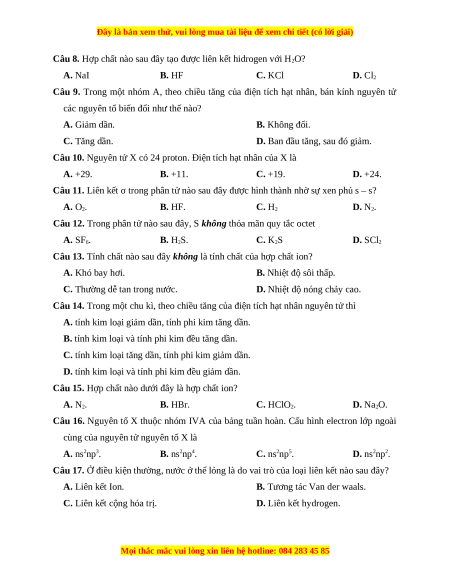 Câu 8. Hợp chất nào sau đây tạo được liên kết hidrogen với H2O? A. NaI B. HF C. KCl D. Cl2