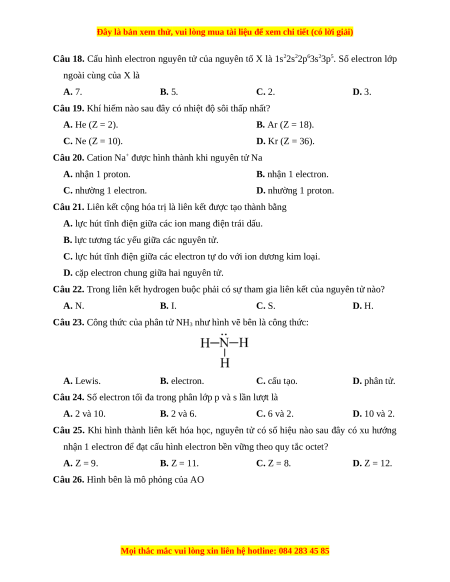 Câu 23. Công thức của phân tử NH3 như hình vẽ bên là công thức: A. Lewis. B. electron. C. cấu tạo. D. phân tử.