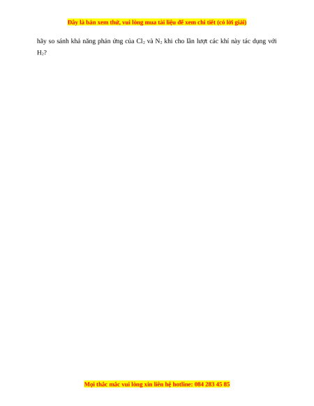 Câu 32. Cho biết năng lượng liên kết của Cl2 và N2 như bảng dưới: Liên kết Cl - Cl N ≡ N E (kJ/mol) 243 945