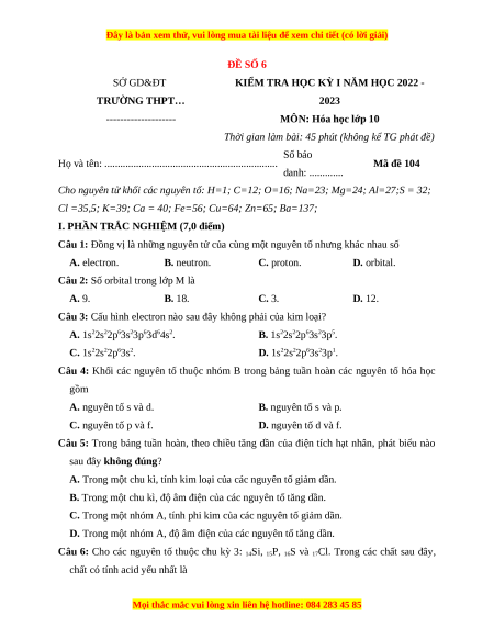 Câu 1: Đồng vị là những nguyên tử của cùng một nguyên tố nhưng khác nhau số A. electron. B. neutron. C. proton. D. orbital.