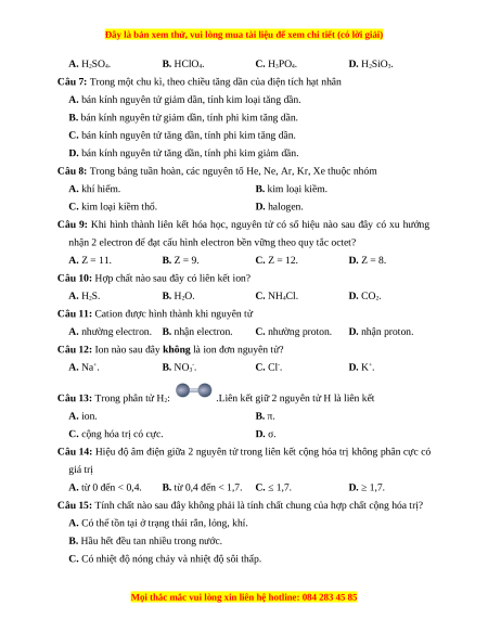 Câu 6: Cho các nguyên tố thuộc chu kỳ 3: 14Si, 15P, 16S và 17Cl. Trong các chất sau đây,