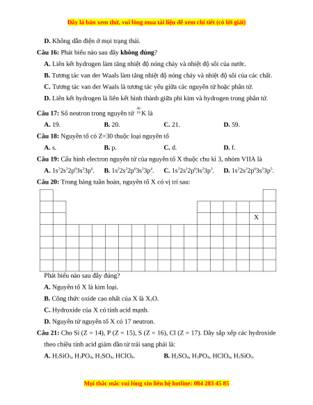 Câu 21: Cho Si (Z = 14), P (Z = 15), S (Z = 16), Cl (Z = 17). Dãy sắp xếp các hydroxide