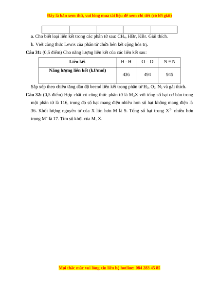 Câu 31: (0,5 điểm) Cho năng lượng liên kết của các liên kết sau: