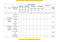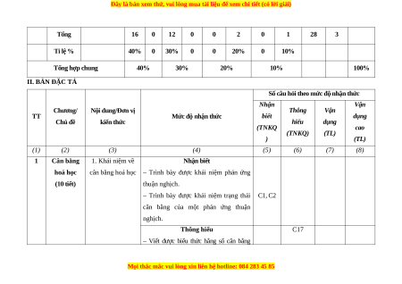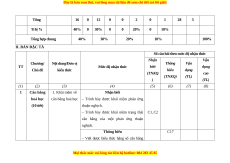+ Mức độ đề: 40% Nhận biết; 30% Thông hiểu; 20% Vận dụng; 10% Vận dụng cao.