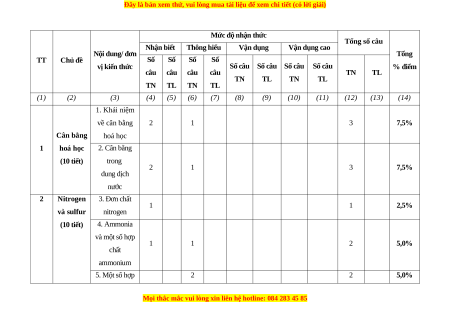 Số câu Số câu Số câu Số câu % điểm câu câu câu câu TN TL TN TL TN TL TN TL TN TL (1) (2) (3) (4) (5) (6) (7) (8) (9) (10) (11) (12) (13) (14) 1. Khái niệm về cân bằng 2 1 3 7,5% Cân bằng hoá học 1 hoá học 2. Cân bằng (10 tiết) trong 2 1 3 7,5% dung dịch nước 2 Nitrogen 3. Đơn chất 1 1 2,5% và sulfur nitrogen (10 tiết) 4. Ammonia và một số hợp 1 1 2 5,0% chất ammonium 5. Một số hợp 2 2 5,0%