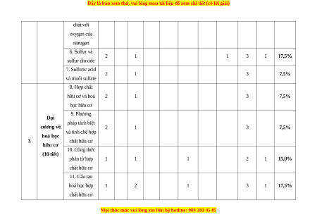chất với oxygen của nitrogen 6. Sulfur và 2 1 1 3 1 17,5% sulfur dioxide 7. Sulfuric acid 2 1 3 7,5% và muối sulfate 8. Hợp chất hữu cơ và hoá 2 1 3 7,5% học hữu cơ 9. Phương Đại pháp tách biệt cương về 2 1 3 7,5% và tinh chế hợp hoá học 3 chất hữu cơ hữu cơ 10. Công thức (10 tiết) phân tử hợp 1 1 1 2 1 15,0% chất hữu cơ 11. Cấu tạo hoá học hợp 1 2 1 3 1 17,5% chất hữu cơ